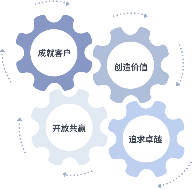 成就客户是一切决策的出发点,,,创造价值是衡量所有工作的标准,,,追求卓越是我们做事做人的态度,,,开放共赢是我们的格局也是最终的结果。。。价值观的齿轮环环相扣,,,推动着组织里的每个人不断向前。。。。
